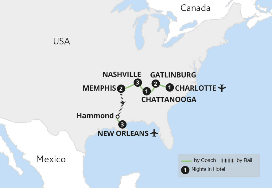 Historic tracks lead us on an unforgettable rail tour through the heartlands of great American music - from Nashville, home of country music, to the blues, soul and rock 'n' roll of Memphis and the expressive jazz of New Orleans. Starting our journey in North Carolina, we discover the music legends of Tennessee, then continue on the City of New...