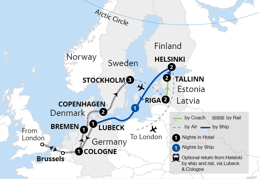 Embark on an amazing exploration of six incredible countries. Travelling through Denmark and Sweden, cross the Baltic Sea to explore the idyllic charms of Latvia, Estonia and Finland, before flying by from Helsinki - or opt to return by ferry and rail. Experience the history and distinct culture of these attractive capital cities, taking in the...