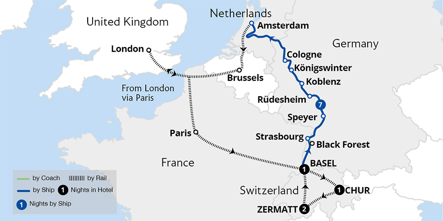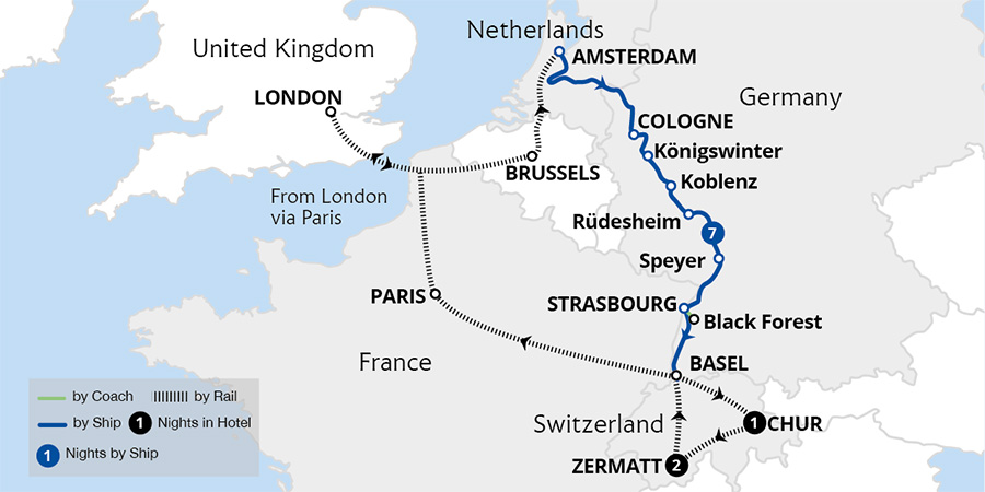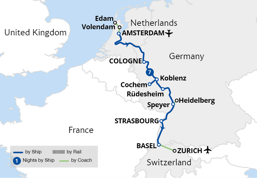 Fly to Amsterdam to experience the breathtaking beauty of the Netherlands to Switzerland on a luxury river cruise. Sail through four countries, admiring stunning forested valleys, charming half-timbered towns and historic cities lining this incredible river's picturesque banks before returning by air from Zürich. Marvel at the spectacular scenery...