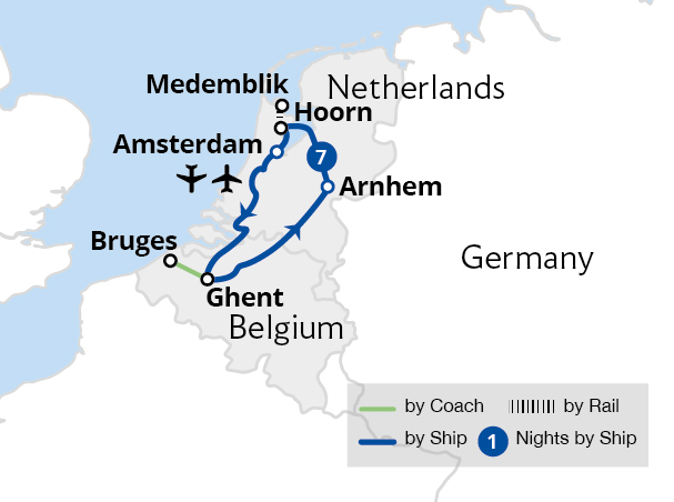 • Belgium: On selected tours, we offer excursions in Ghent and Bruges. Bruges is a medieval city known for its canals, cobblestone streets and well-preserved Gothic architecture, while Ghent brings together medieval landmarks, a popular art scene and delicious chocolate.