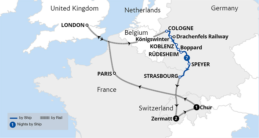 Enjoy one of the world's finest rail journeys aboard the legendary Glacier Express to Zermatt and admire Matterhorn views from the charming Gornergrat Railway. Descending the Alps, set sail on a sensational Rhine cruise, indulging in luxurious amenities and superb service. Enroute, savour incredible vistas of the stunning Rhine Gorge.