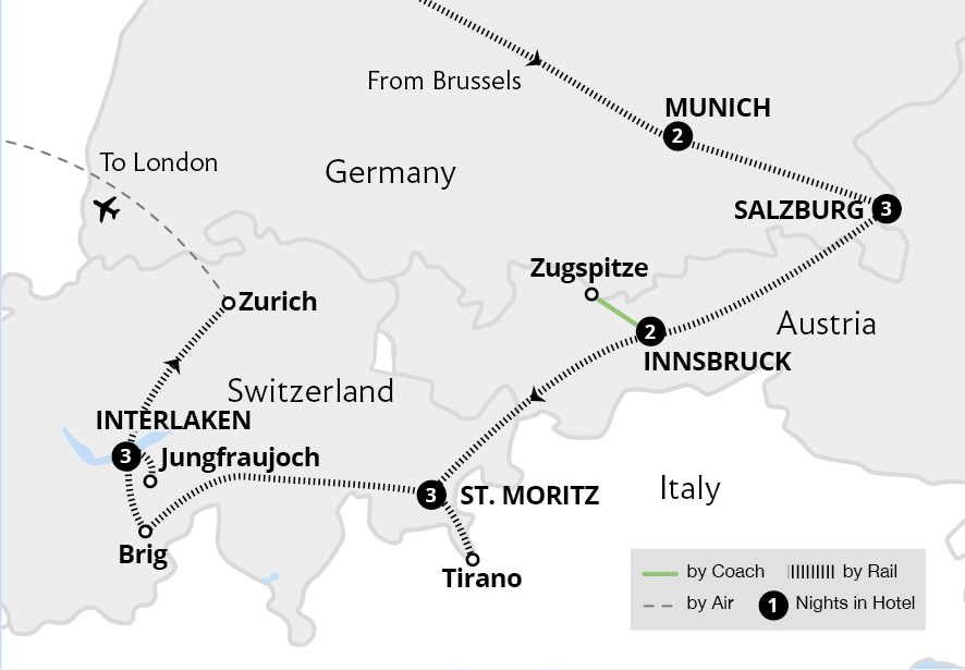 Your alpine holiday begins as we meet our fellow travellers and Tour Manager at London St Pancras to join the Eurostar to Brussels, enjoying a light meal at our seats. From the Belgian capital, we travel to Cologne and onwards through Germany to Munich in First Class.